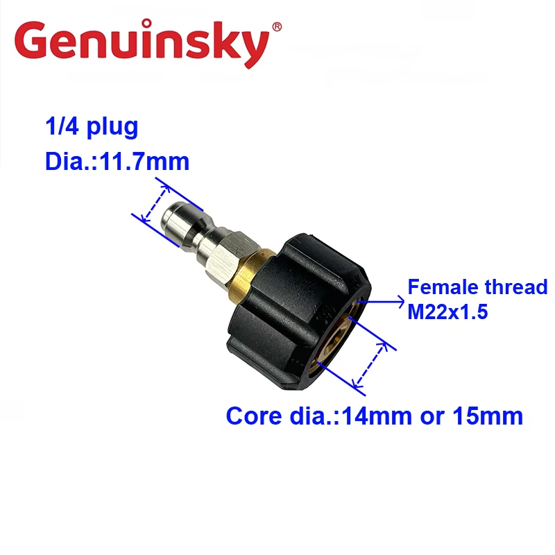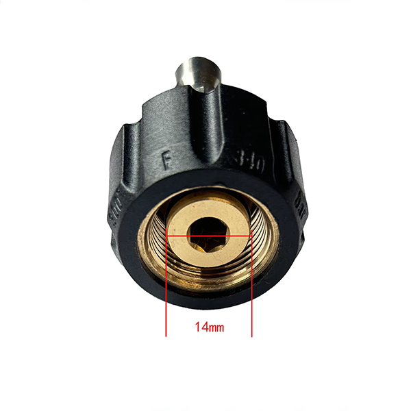Produk ini adalah palam cepat 1/4 inci. Diameter palam cepat adalah 11.7m, dan hujung yang lain adalah benang wanita M22 × 1.5. Terdapat dua diameter lubang untuk dipilih, teras dia.14mm atau 15mm. Ia digunakan secara meluas dalam banyak senario pembersihan tekanan tinggi dalam masyarakat moden.