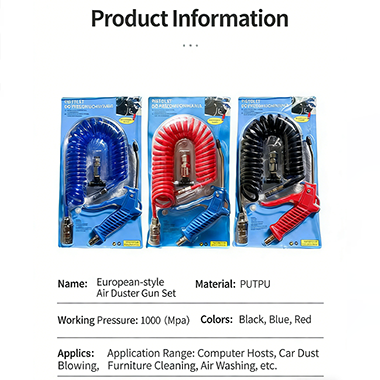 Kit Pistol Udara Pneumatik Gaya Eropah termasuk pistol habuk, trakea spring teleskopik dan penyambung pantas, yang boleh dipasang dan digunakan dengan cepat selagi ia berada di luar kotak. Pistol habuk boleh didapati dalam warna hitam, biru dan warna lain. Badan menggunakan tong keluli tahan karat yang langsing. Reka bentuk ini membolehkan peralatan mudah mencecah celah sempit yang tidak mudah dibersihkan, seperti kekunci papan kekunci, celah dalaman kereta dan alur keluar penghawa dingin atau pembersihan bahagian jentera industri. Dengan muncung udara plastik tetap, aliran udara yang menyapu boleh menjadi lebih pekat dan penyingkiran habuk yang tepat boleh dicapai. Badan pistol menggunakan pemegang ergonomik, yang bukan sahaja sesuai dengan tapak tangan, menjadikan pengguna lebih selesa, tetapi juga boleh dipegang dengan satu tangan untuk mengeluarkan habuk, dan tidak mudah berasa letih walaupun anda menggunakannya untuk masa yang lama. Pemegangnya juga mempunyai corak anti-slip yang bertimbang rasa, yang boleh meningkatkan kestabilan cengkaman dan tidak mudah tergelincir. Badan senjata itu sendiri diperbuat daripada plastik bertetulang berketumpatan tinggi, yang diperbuat daripada kekerasan tinggi. Dalam menghadapi beberapa benjolan dan geseran dalam penggunaan harian, ia tidak mudah pecah, menjadikan produk lebih tahan lama. Dan ketumpatan bahan jauh lebih rendah daripada logam, yang menjadikan keseluruhan pistol habuk lebih ringan dan lebih mudah alih. Ia boleh menyokong sambungan pneumatik, dan dengan trakea atas dan sumber udara, aliran udara yang dihasilkan boleh menjadi lebih kuat, yang boleh dipenuhi untuk pembersihan harian dan penyelenggaraan industri, daripada penyingkiran habuk ringan kepada penyingkiran habuk sederhana.