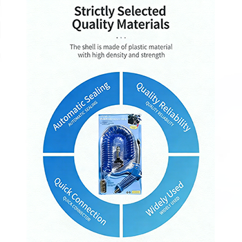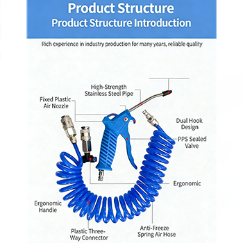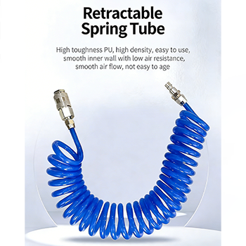 trakea spring teleskopik dalam saman itu diperbuat daripada bahan PU, dan terdapat tiga warna untuk dipilih: hitam, biru dan merah. Dinding dalaman bahan PU yang sangat lasak adalah licin, yang menjadikan rintangan angin lebih rendah dan aliran udara akan menjadi lebih lancar. Pada masa yang sama, bahan PU mempunyai rintangan haus yang sangat baik dan rintangan penuaan, dan tekanan kerja boleh mencapai 1000 Mpa, yang boleh memberikan aliran udara yang kuat dalam kerja penyingkiran habuk, menjadikan kerja penyingkiran habuk lebih cekap. Penyambung cepat pada kedua-dua hujung trakea juga sangat praktikal. Reka bentuk pemalam tidak memerlukan alat, dan sambungan dengan pistol udara dan sumber udara boleh diselesaikan dalam beberapa saat, yang meningkatkan kecekapan operasi.