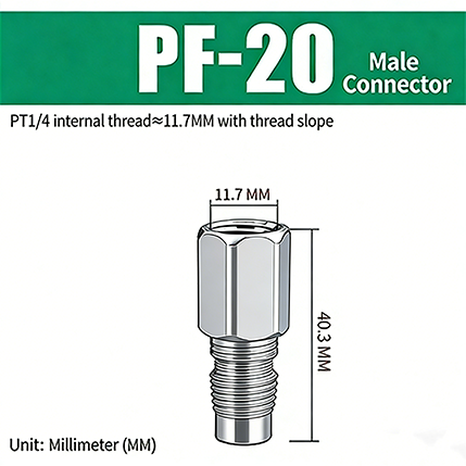 1. PF-20. benang paip 1/4, dengan cerun benang, diameter bahagian benang adalah kira-kira 11.7 mm, dan jumlah panjang produk ialah 40.3 mm.