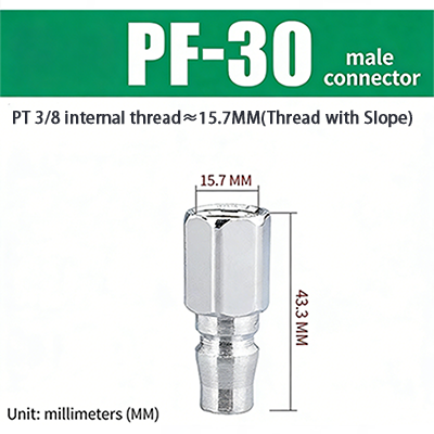 2. PF-30. benang paip 3/8, dengan cerun benang, diameter bahagian benang adalah kira-kira 15.7 mm, dan jumlah panjang produk ialah 43.3 mm.