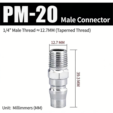 1. PM-20. Benang luar 1/4 inci ialah struktur benang luaran berbentuk kon. Diameter bahagian berulir ialah 12.7 mm, dan jumlah panjang produk ialah 39.3 mm.
