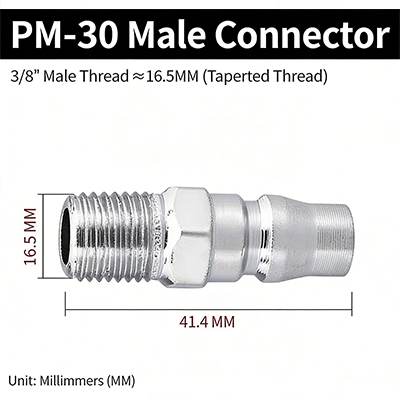 2. PM-30. Benang jantan 3/8 inci ialah struktur benang luaran berbentuk kon. Diameter benang: 16.5mm, dan panjang keseluruhan ialah 41.4mm.