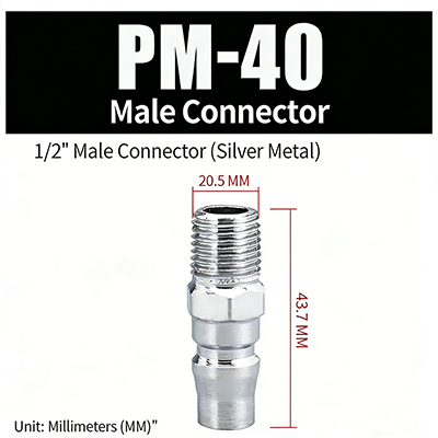 3. PM-40. Penyambung lelaki 1/2 inci, diameter benang ialah 20.5 mm, dan panjang keseluruhan ialah 43.7 mm.