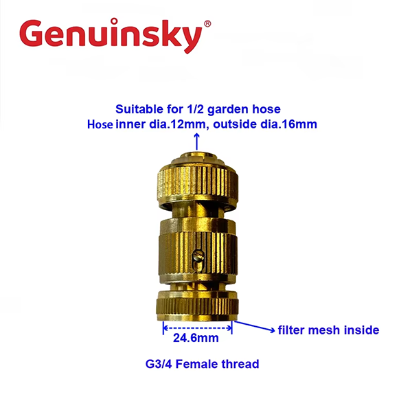 Produk ini adalah penyambung inlet mesin basuh tekanan, sesuai untuk 1/2 hos taman, dia.12mm dalam, di luar dia.16mm, dan ujung yang lain adalah benang G3/4 Fem ale, dengan diameter 24.6mm, mempunyai penapis di dalamnya.